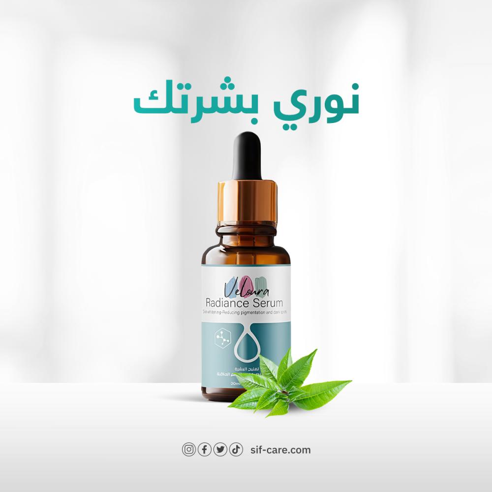 ● ضعي بضع قطرات من Veloura Radiance Serum على وجهك ورقبتك، ووزعيها بالتساوي.