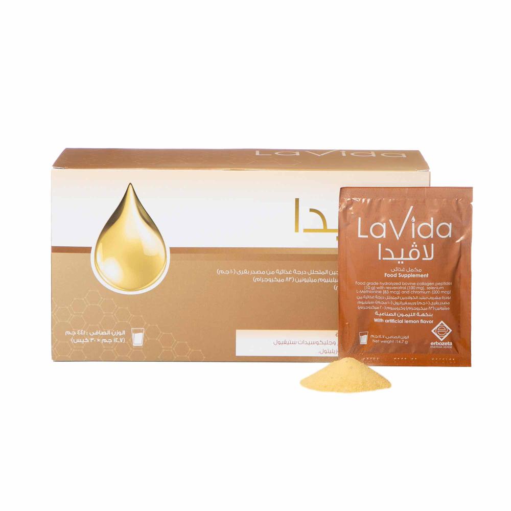 يعد لافيدا مكمل غذائي يساعد على تحسّين الصحة العامة للجسم عن طريق ضمان الحصول على الكمية الكافية من العناصر الأساسية التي تحتاج إليها لأداء الوظائف الطبيعية بشكل سليم فهو مهم للصحة العامة بفضل إحتوائه على الكولاجين البقري والكركم، وبالتالي فهي تساعد في الحفاظ على صحة أجهزة الجسم والشعور بالحيوية والنشاط واعطاء النضارة للجلد.
